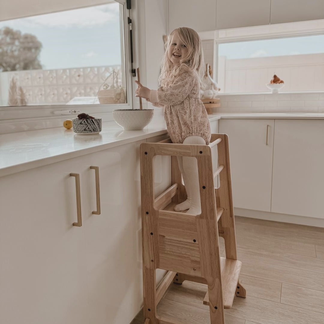 Our Learning Tower is perfectly designed for every family. It encourages your kids to play, learn and assist you in the kitchen and keep them busy and safe by your side.